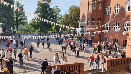 Auch bei zukünftigen (Schul-) Festen sollen die angefertigten Wimpelketten aufgehängt werden und das Schulgebäude des Schadow-Gymnasiums schmücken.